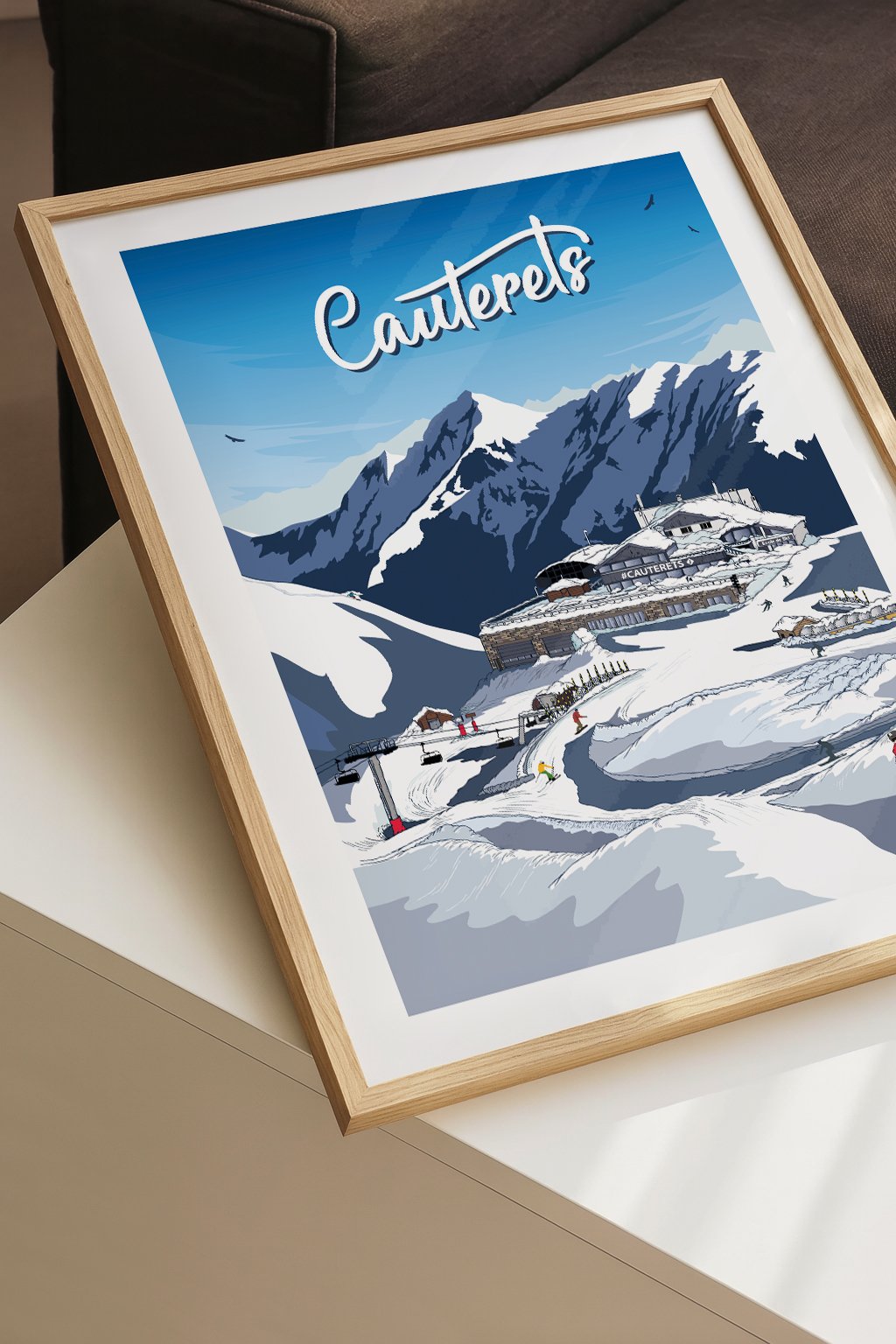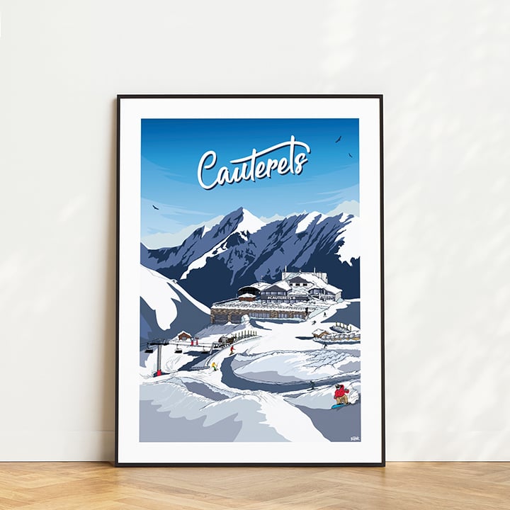 Inspirée du style des anciennes affiches de voyage, cette création rend hommage à l'un des plus beaux villages de montagne de France, célèbre pour ses termes, ses pistes enneigées et ses paysages spectaculaires. Pensée comme une oeuvre décorative authentique, cette affiche capture l'atmosphère unique de Cauterets et l'esprit chaleureux des Pyrénées. Un visuel idéal pour tous les amoureux de montagne, de ski et snowboard ou de nature préservée.